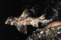 There are 10 different species using the same genus, Heterodontus. Commonly called Bullhead sharks, they are an odd looking bunch. They don’t grow to be very large – the largest, the Port Jackson shark growing to 5 1/2 feet. The smallest, the Galapagos bullhead only grows to about 2 feet. The all have a small snout that resembles that of a pig. Their very small mouths conceal jaws that have small grasping teeth in front and smooth grinding teeth near the rear. The name Heterodontus means just that –‘different teeth’. The teeth are specialized for eating crustaceans and mollusks. Another obvious characteristic of this species, are the two fin spines on each of its dorsal fins. These act as a fairly effective defense mechanism. In at least one instance caught on film, a California angel shark promptly regurgitated a small horn shark that it tried to swallow.