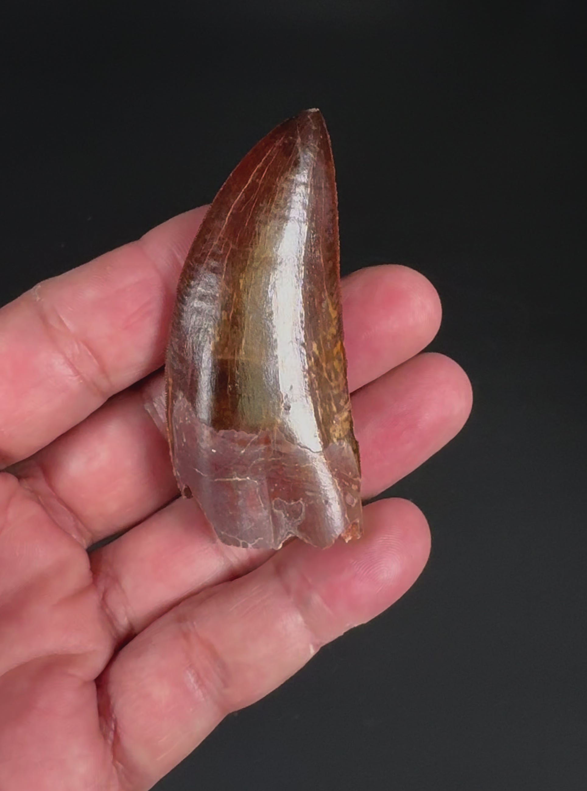Here is a high-quality Carcharodontosaurid tooth from the Upper Cretaceous period of the Kem Kem Group in Morocco. It features intact, sharp serrations with interesting wrinkles along the edges. The enamel is smooth and glossy, and part of the root remains attached.